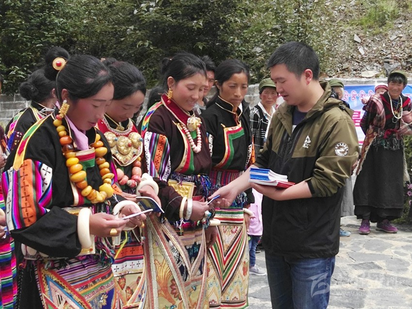 稻城亞丁景區(qū)管理局工作人員向拉木格村村民發(fā)放民族團結(jié)宣傳資料。