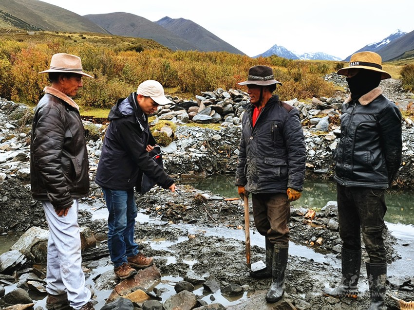 任剛和村民商議修建蟲草山便橋橋墩基腳。