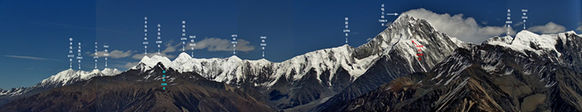 王志偉坦言:“拍攝不難,但核準校對費時費力。因為空間角度關系,每一座山峰的確定都需要花費大量時間奔走于不同的觀景點進行拍照,并反復比對衛(wèi)星地圖,最后從山形、與主峰的距離等方面準確定位山峰的位置?!北热缭跇俗⑷諡跚曳鍟r,他將另一座山峰誤標,在最后一次比對時才發(fā)現(xiàn),又重新調(diào)整定位;而另外一座叫年波貢嘎的山峰,由于角度原因全景拍攝不到而作了單獨標注,所以并未呈現(xiàn)于全景標注圖中。
