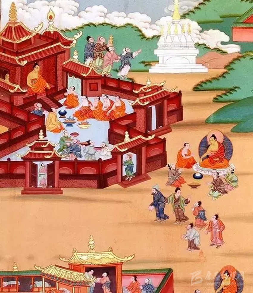 曬佛節(jié)時,寺院內(nèi)依墻懸掛一幅幅精美畫卷。這些畫用純天然顏料及金粉、銀粉繪制。畫中人物形象生動,山川、花卉烏獸和諧、線條流暢、章法嚴謹、色澤艷麗、栩栩如生。這套保存至今的《如意寶藤》唐卡畫,共三十一幅(現(xiàn)只有:9幅,另外兩幅文革期間失蹤), 至今猶如新著色的一般。其中, 由郎卡杰描繪的米拉日巴講經(jīng)圖,在只有幾平方毫米的空間中畫出了巖洞內(nèi)米拉日巴在講經(jīng),以及洞外獵犬和鹿聽經(jīng)等生動形象,其姿態(tài)美麗、線條清楚、色彩明亮,達到了傳神的藝術感染力,人們稱他是“巧奪天工之神”。據(jù)藏畫人員介紹,該畫在作色、筆畫等風格方面是模仿漢地的技法,風景、建筑物以及佛身上的裝飾品畫得非常逼真,這種畫法至今仍然在甘孜縣部分地方流行。