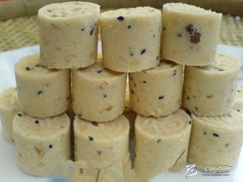 八寶年糕 原料 糯米1000克,白糖、麻仁青梅、葡萄干、瓜條、白蓮、桃脯、豬油各20克。 做法 先將糯米淘洗干凈,水浸24小時(shí)后上蒸籠蒸爛,取出用木棒搗爛攤涼,把白糖等搓勻成餡,在方盤內(nèi)刷豬油,鋪上搗爛的1厘米厚的糯米飯,每鋪一層放入適量的餡,共鋪3層,蒸熟后用刀切為小塊即成。 夾心年糕 原料 糯米1000克,青紅絲、小豆、白糖各50克。 做法 將糯米洗凈浸泡24小時(shí)后上蒸籠蒸爛,取出用木棒搗爛后展切成2塊,把小豆煮爛加糖再加青紅絲做成餡撒于其中一塊上,再將另一塊放在餡上壓實(shí)壓緊,用刀切成塊即可。